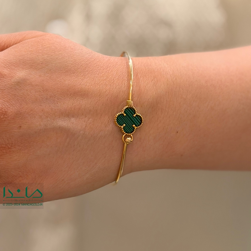 بنگل ونکلیف سبز – این محصول حالت بنگلی دارد اما در روی کار یک قفل جهت اطمینان دارد . این محصول با سنگ ونکلیف مالاکیت ساخته شده و وزن سنگ هم کسر شده است .